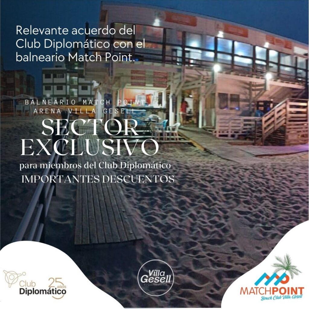 Nos complace anunciar una nueva alianza estratégica que expande los beneficios de nuestra membresía hacia la Costa Atlántica. El Club Diplomático ha firmado un acuerdo con el Balneario Match Point, situado en el exclusivo predio de Arena Gesell, para brindar ventajas competitivas a todos nuestros socios durante los meses de verano.