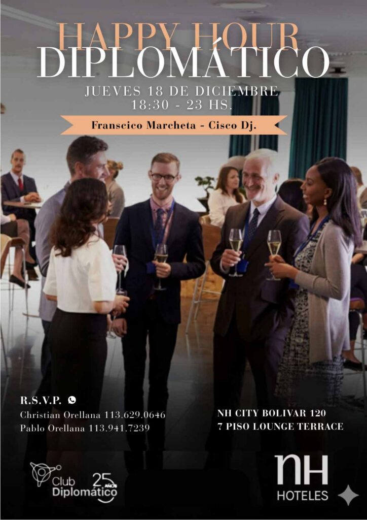 El próximo 18 de diciembre, el Club Diplomático invita a una nueva edición de su clásico Happy Hour, consolidándose como el punto de encuentro referente para la comunidad internacional en Buenos Aires. El evento se llevará a cabo en el Lounge Terrace del NH City, ubicado en Bolívar 120.